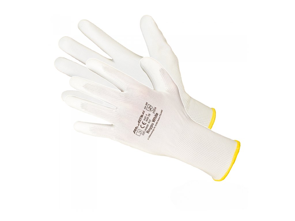 Bílé pracovní rukavice jsou vyrobené z polyesterového úpletu, potažené bílým polyuretanem (PU) a zakončené elastickou manžetou. Barva elastické manžety se liší podle velikosti rukavic.