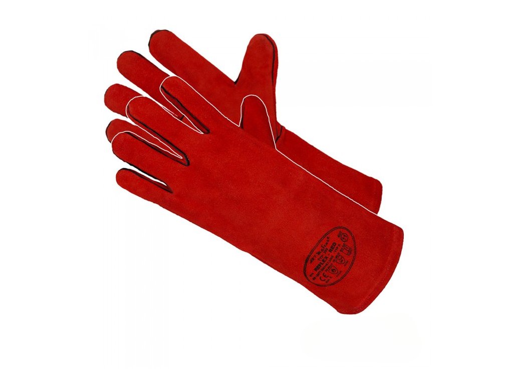 Pracovní pětiprsté svářečské rukavice z červené štípané hovězí kůže.